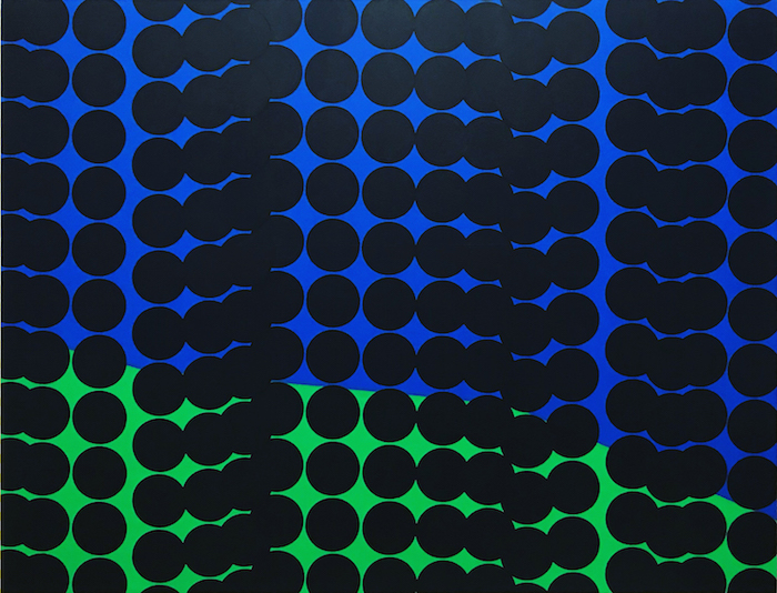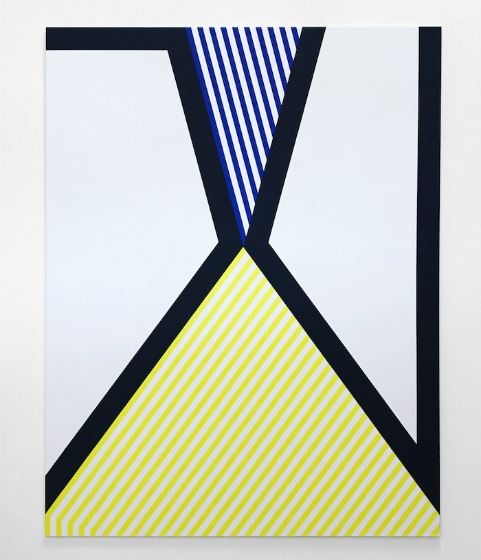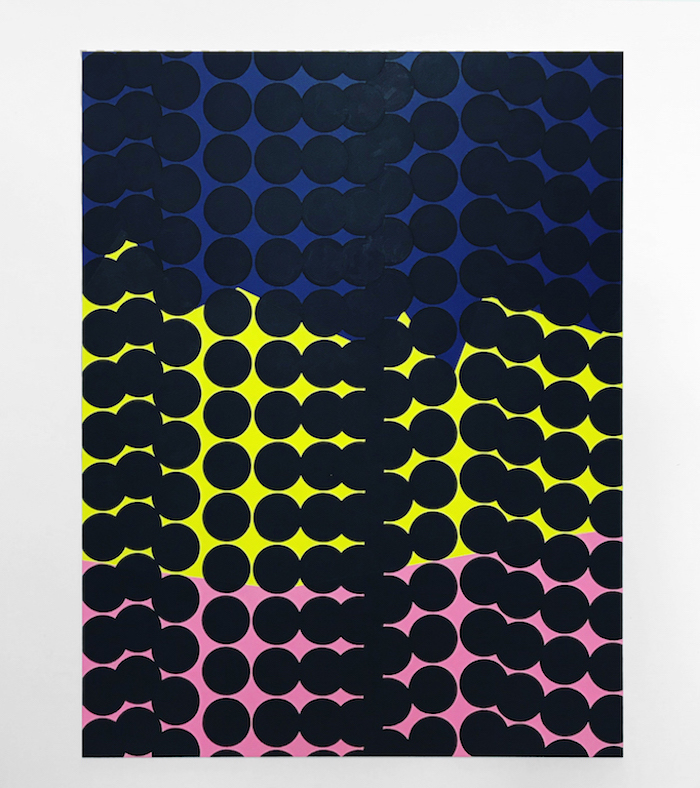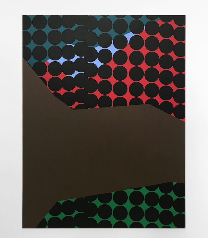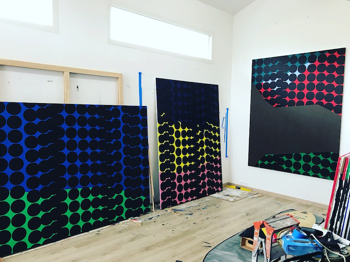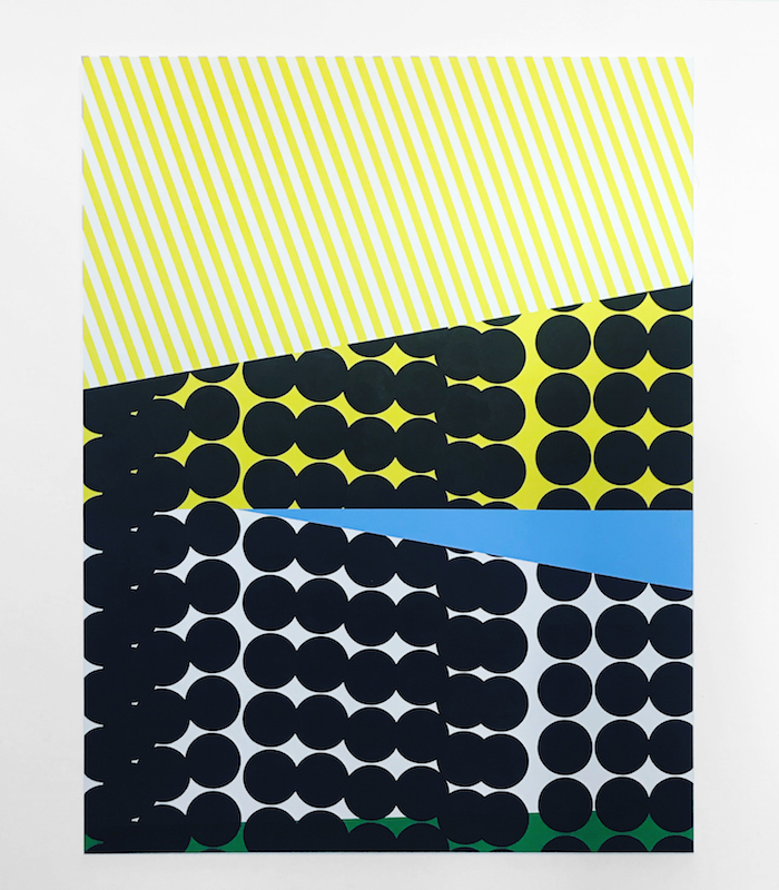 SANS TITRES Acrylique sur toile, 220 x 170cm, 2018. Il s'agit de paysages sur lesquels je peint des pastilles de pare-soleil de voitures. Je les découpe et les disposent à la manière de rideaux dont les motifs viennent perturber la lecture des paysages.