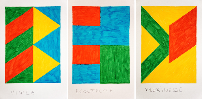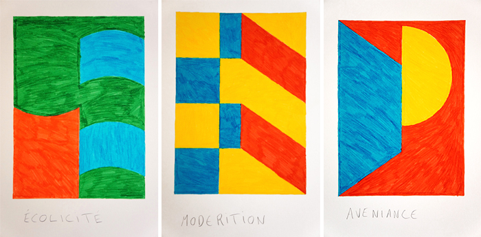 Dans son travail, Sebastien Thebault-Belarra élabore des formes géométriques abstraites à partir d’observations d’éléments tirés du monde réel. Il compile lors de ses voyages panneaux publicitaires, panneaux de signalisation routière et ferroviaire, éléments architecturaux et éléments graphiques collectés ça et là dans la presse. Une matière qu’il va par la suite ré-arranger au gré d’empiries formelles jusqu’à atteindre un équilibre satisfaisant.