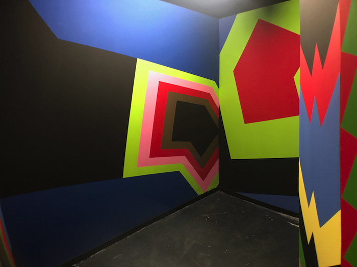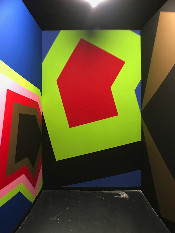 PAS DE PANIQUE C'EST DE L'ACRYLIQUE, wallpainting, 2017. SHOWROOM#1 - Sebastien Thebault & Co, Silicone, Bx. Pour cette intervention murale, l’idée était de partir d’une forme, deux carrés superposés légèrement décalés formant une sorte de w et de l'essorer par des opérations de zoom, de décalage...etc.